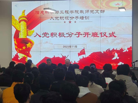 为深入学习贯彻习近平新时代中国特色社会主义思想,加强党员队伍建设,严把党员“入口关”,引导入党积极分子坚定理想信念、锤炼政治品格,11月25日,信息科学与工程学院党委在109B教室隆重举行入党积极分子培训班开班仪式。信息科学与工程学院党委书记张治海、副书记冯川、组织员张娣及全体入党积极分子出席本次仪式。