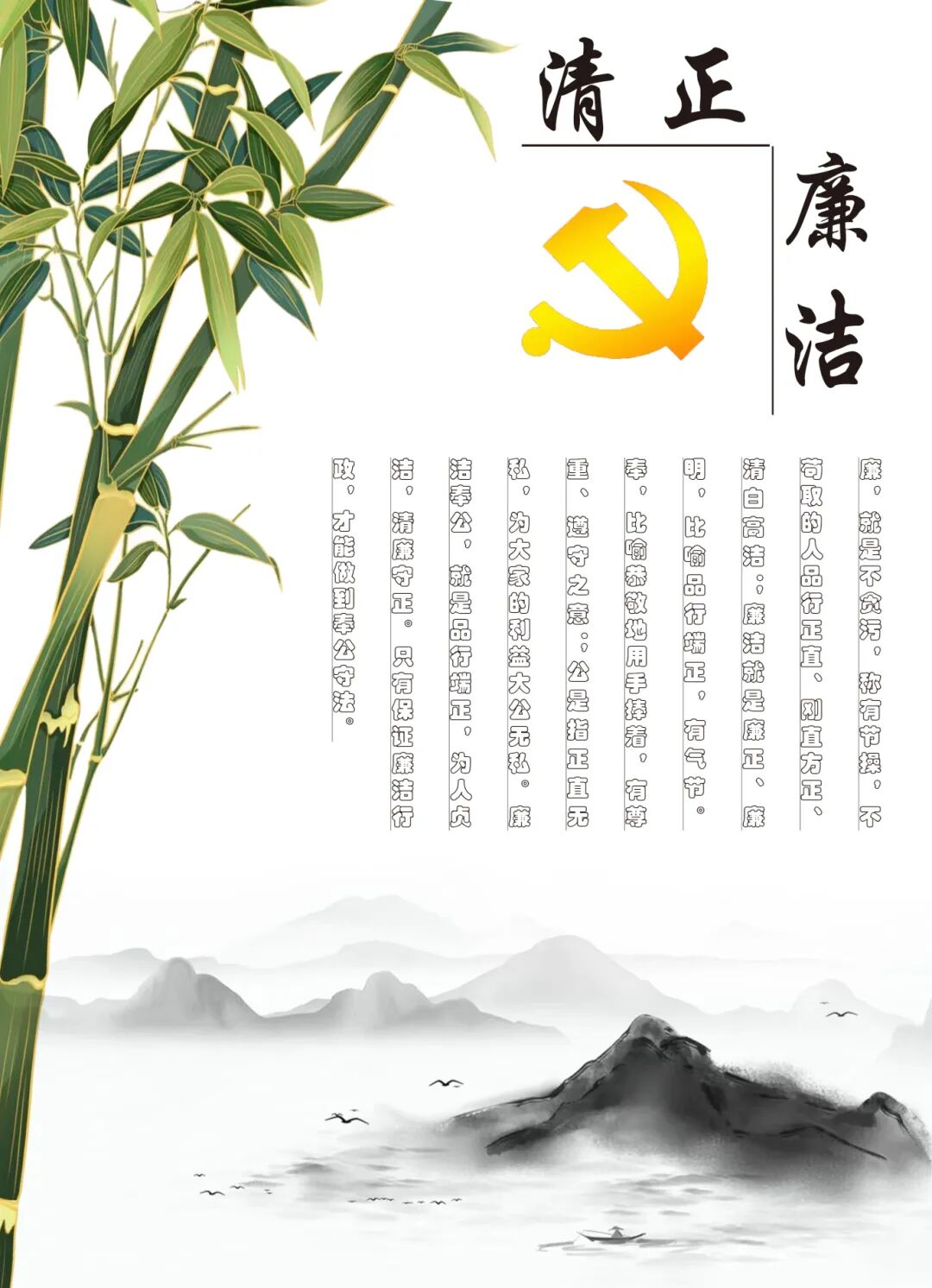 师生们围绕 “清正廉洁” 这一核心主题,结合教育初心、师德师风、校园文化等内容,充分发挥想象力与创造力,将廉洁理念融入艺术创作之中。一幅幅主题鲜明、创意十足的海报作品,或用清新雅致的国风笔墨,以竹之高洁、莲之清逸为意象,诠释 “出淤泥而不染” 的廉洁品格;或用生动鲜活的插画设计,以教师守护学生成长的温暖画面,传递 “清白育人、静待花开” 的教育初心;或用创意排版与经典名句结合,将 “勤以为民,廉以养德” 的廉洁箴言融入视觉设计,让廉洁文化可感可触。