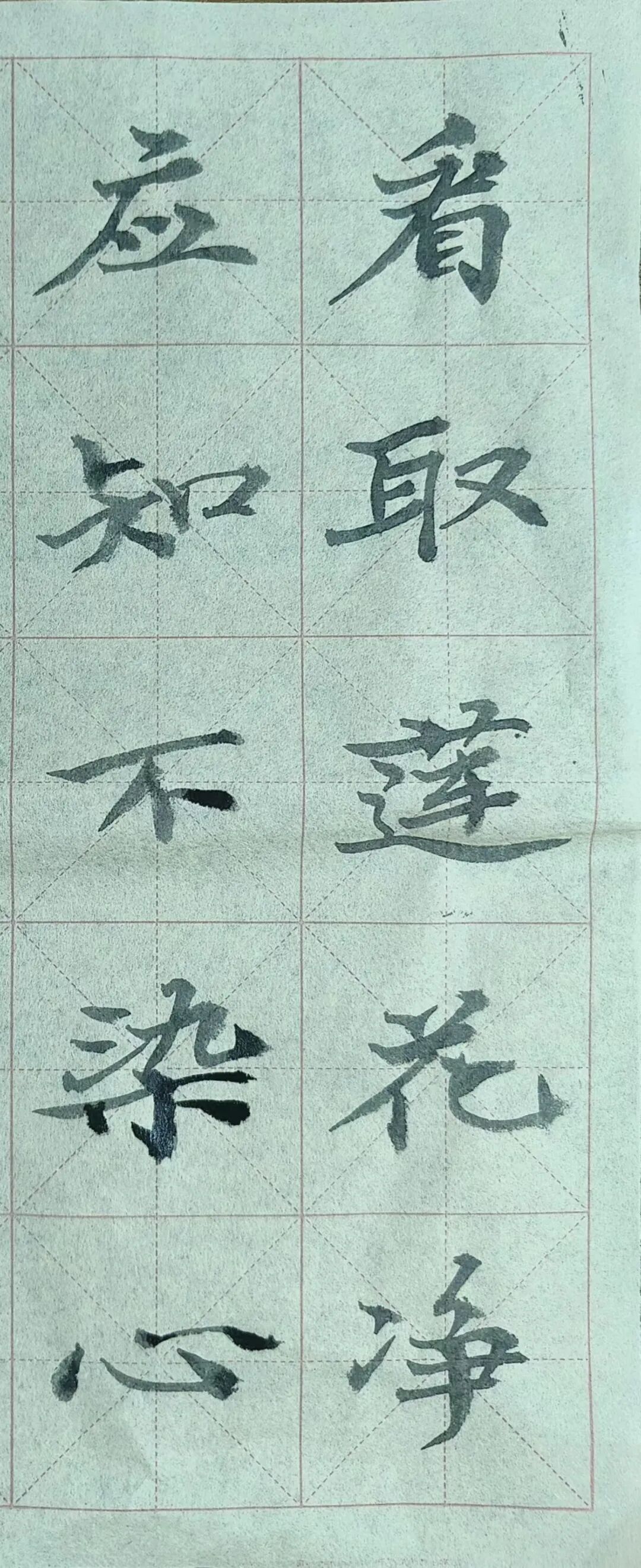 毛笔书法作品以 “看取莲花净,应知不染心” 为书写内容,同学笔墨工整、章法严谨,一笔一画尽显扎实功底与静心修为。作品以莲之清雅洁净喻人之清廉本心,巧借莲花 “出淤泥而不染” 的特质,诠释心怀澄澈、不慕浮华、修身律己的内涵,在墨韵书香中传递崇廉尚洁、守正养心、清白做人、干净做事的价值追求。