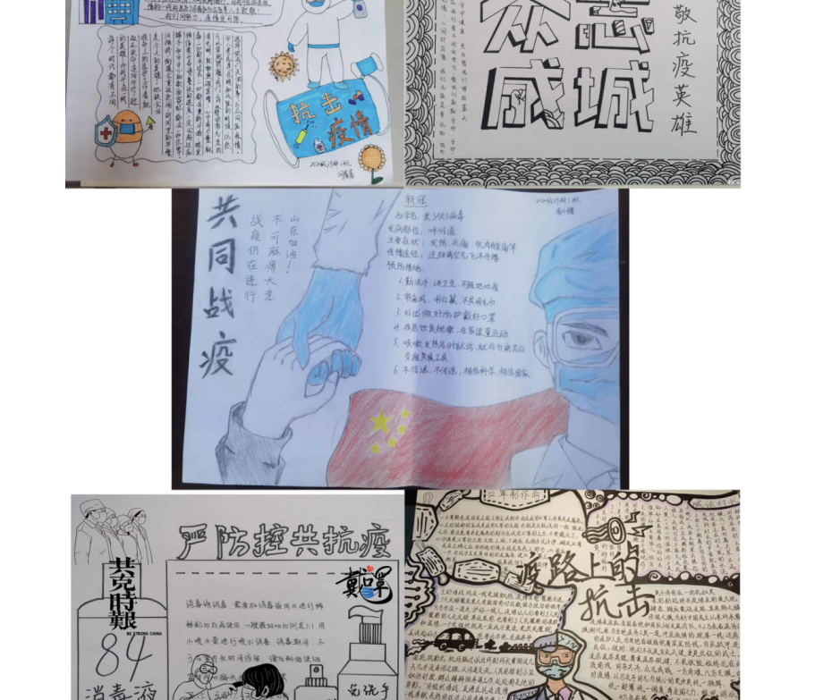 同学们通过自编自绘,用手抄报展现了自己对抗击疫情的决心,从作品中,我们看到了suncitygroup太阳新城学子对抗病毒的必胜决心,看到了对防疫人员的崇敬和感激。疫情中,来自全国各地的“抗疫英雄”,让我看到了人世间的真善美。各地医生、护士奋勇争先,主动请愿,驰援武汉,他们舍小家、顾大家。我永远也忘不了他们穿着厚重的防护服留下的背影,忘不了他们摘下护目镜脸上勒出的痕迹,忘不了因为消毒水的浸泡而干裂、发炎的那双手