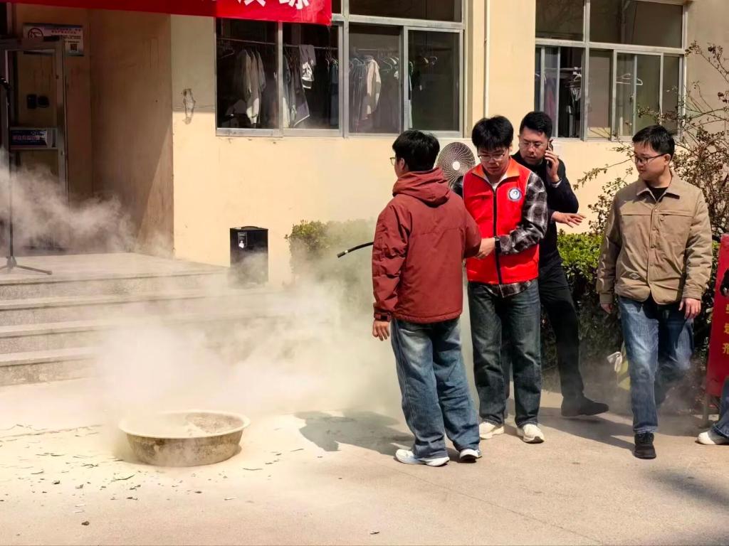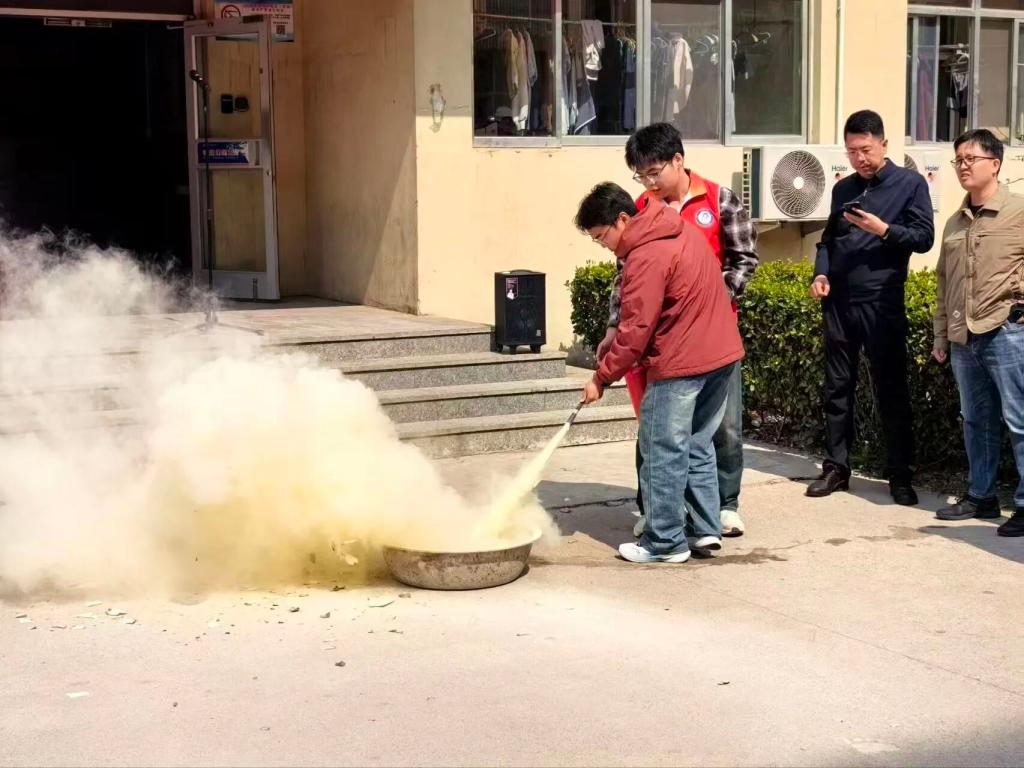 疏散完成后,现场开展了灭火器实操教学。老师详细讲解了“提、拔、握、压”的使用要领,同学们分组上前实操,亲手掌握初期火灾扑救技能。演练最后,学院领导进行总结讲话,强调宿舍消防安全的重要性,提醒同学们杜绝违规用电,时刻绷紧安全之弦