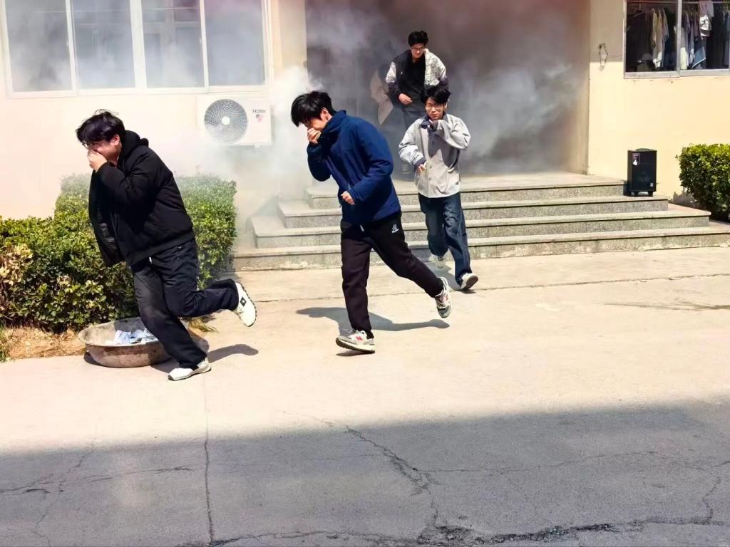 在学生公寓U楼,消防疏散演练正式拉开帷幕。随着模拟火情的烟雾升起,警报声响起,同学们迅速用湿毛巾捂住口鼻、弯腰低姿,沿着预定路线快速、有序地撤离至安全区域,整个过程紧张高效、秩序井然。