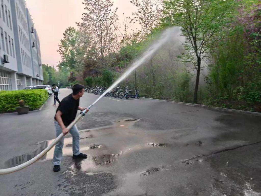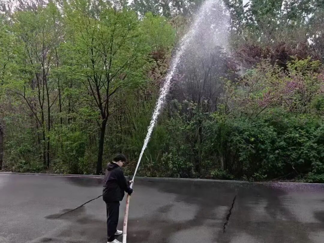校园里,同学们用消防水带冲洗清理柳絮,正是最直接的防范手段。